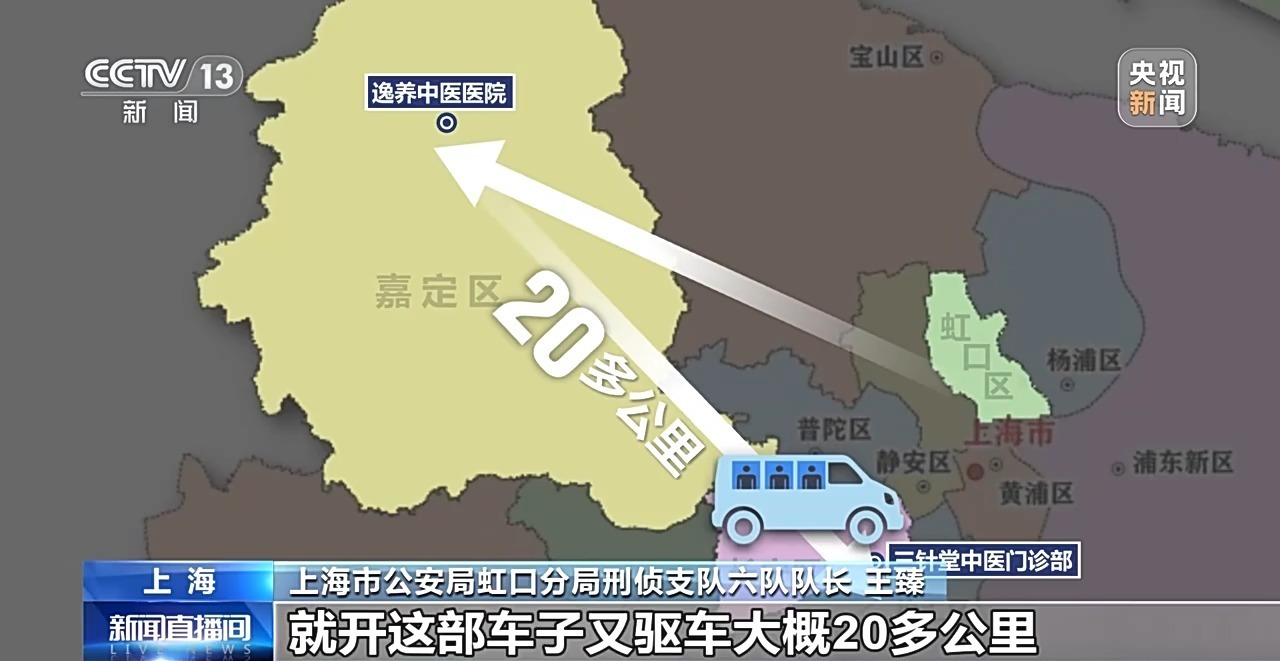 上海市公安局虹口分局刑侦支队六队队长 王臻:因为这家医院是开在嘉定的,那按照道理来讲,它是一家民营的中医门诊部,大部分的一些就诊的患者应该是嘉定本地人才对,如果一个住在外区的人,很固定地每两周或者每一周去中医门诊部去看病,这是很难坚持的一个事情。