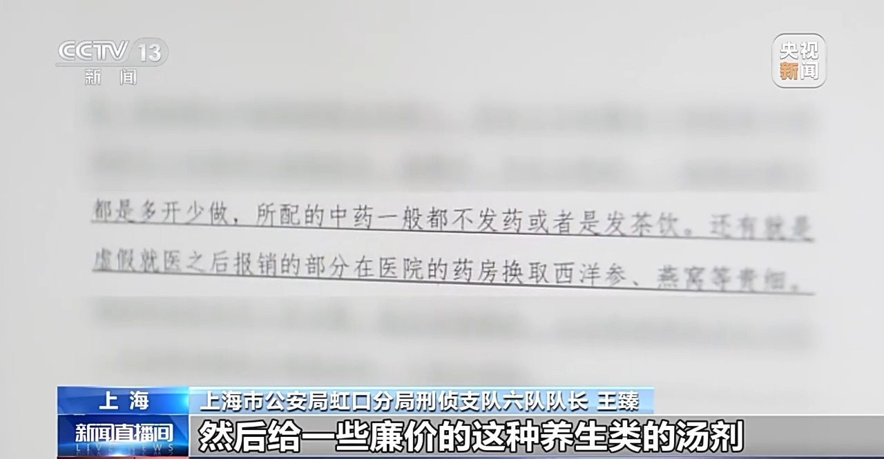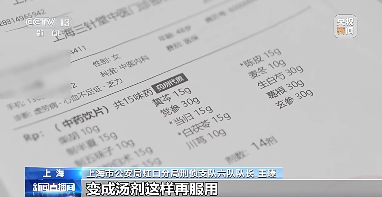 上海市公安局虹口分局刑侦支队六队队长 王臻:开配一些名贵的,比如说党参、鹿茸等等一些比较名贵的中药材,然后给一些廉价的这种养生类的汤剂、养生类的茶饮,这个配方其实成本只有一块钱。但是他每一次在医院里面配出来这种中药,基本上都要上千块。