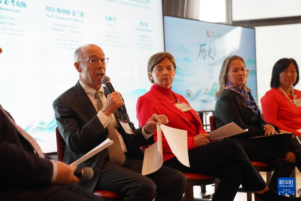 11月25日,在美国纽约举行的2025鼓岭论坛上,史迪威家族代表、史迪威将军外孙特里·史蒂文·考克斯(左一)分享先人与中国人民共同抗战的历史。新华社记者张凤国摄
